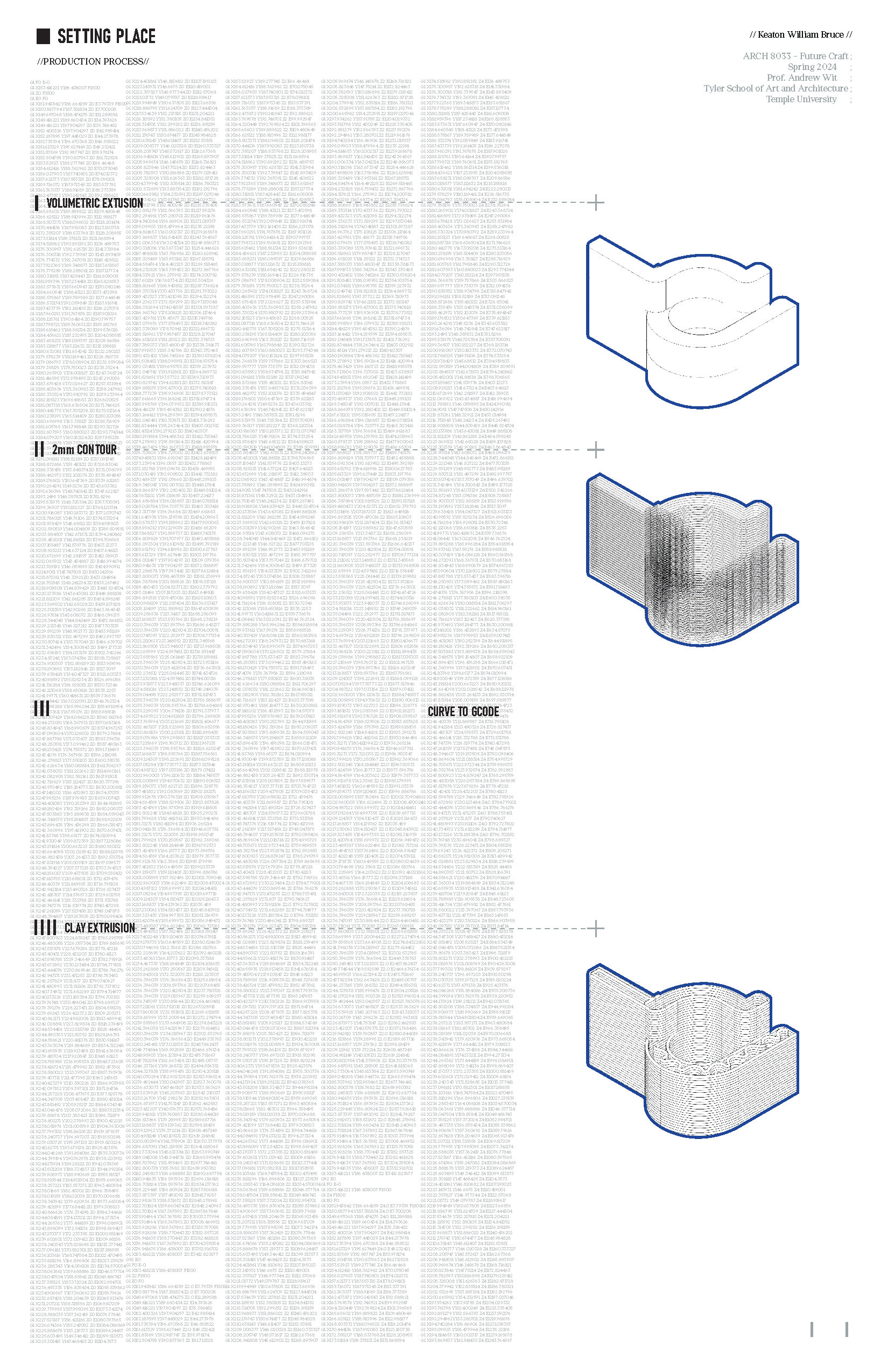 This semester will focus on 3D printed ceramics but may also frame the discipline through other emerging tools such as large-scale 3D/4D printing, robotics, AR/MR/VR and AI. Projects will be speculative and focus on the design, representation, and development of design processes necessary to produce small-scale artifacts, and large-scale architectural façade systems utilizing emerging tools such as ceramic 3D printing.